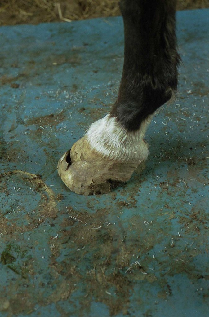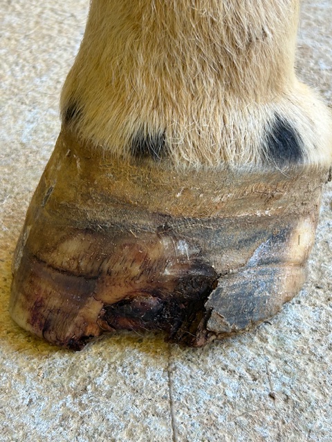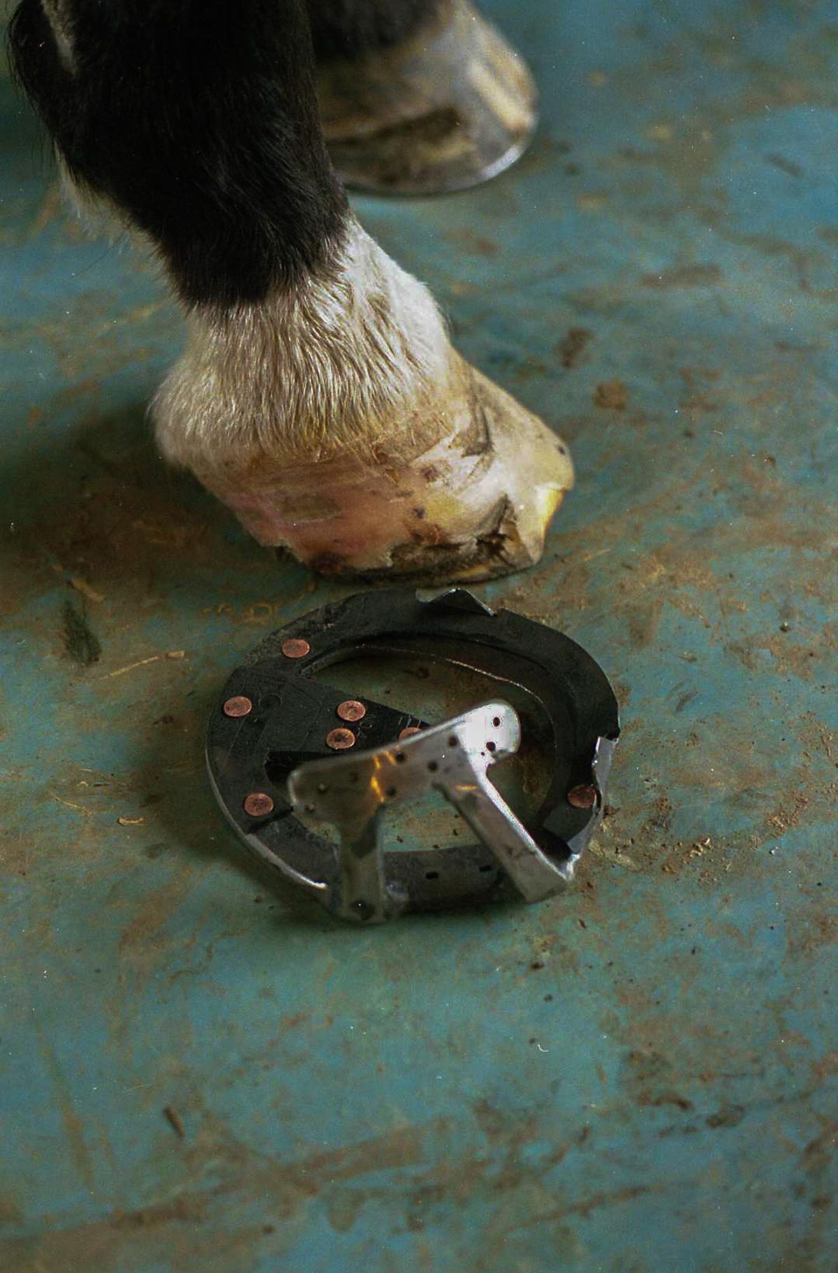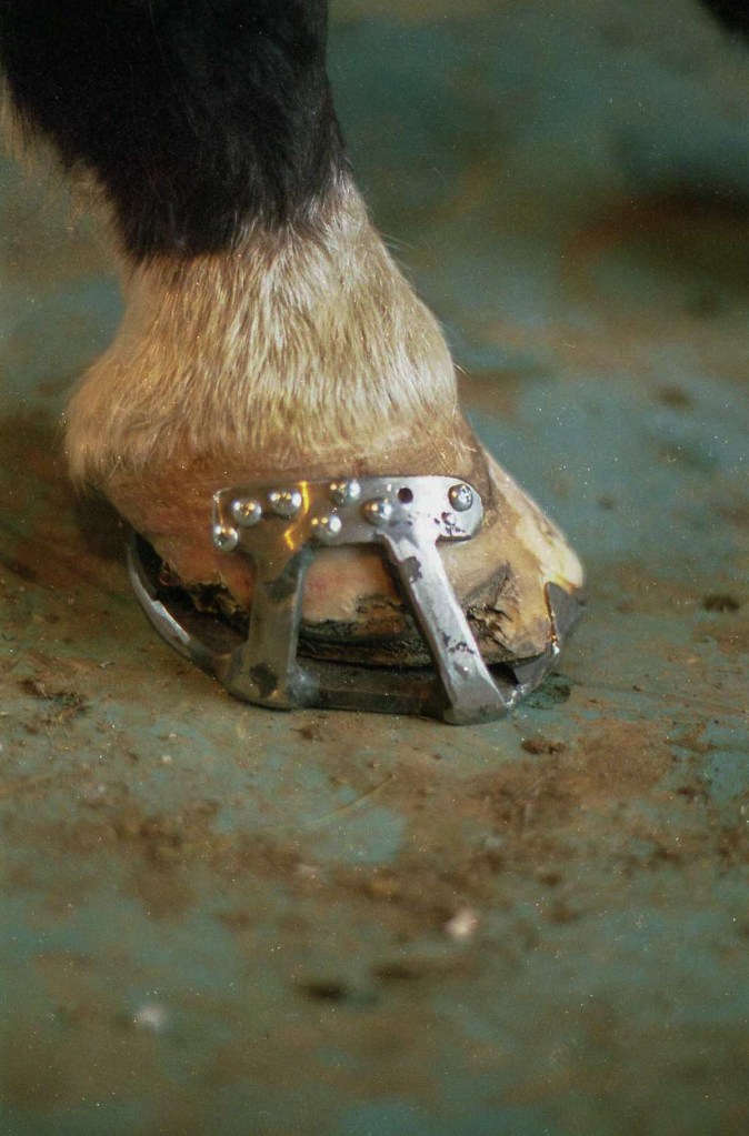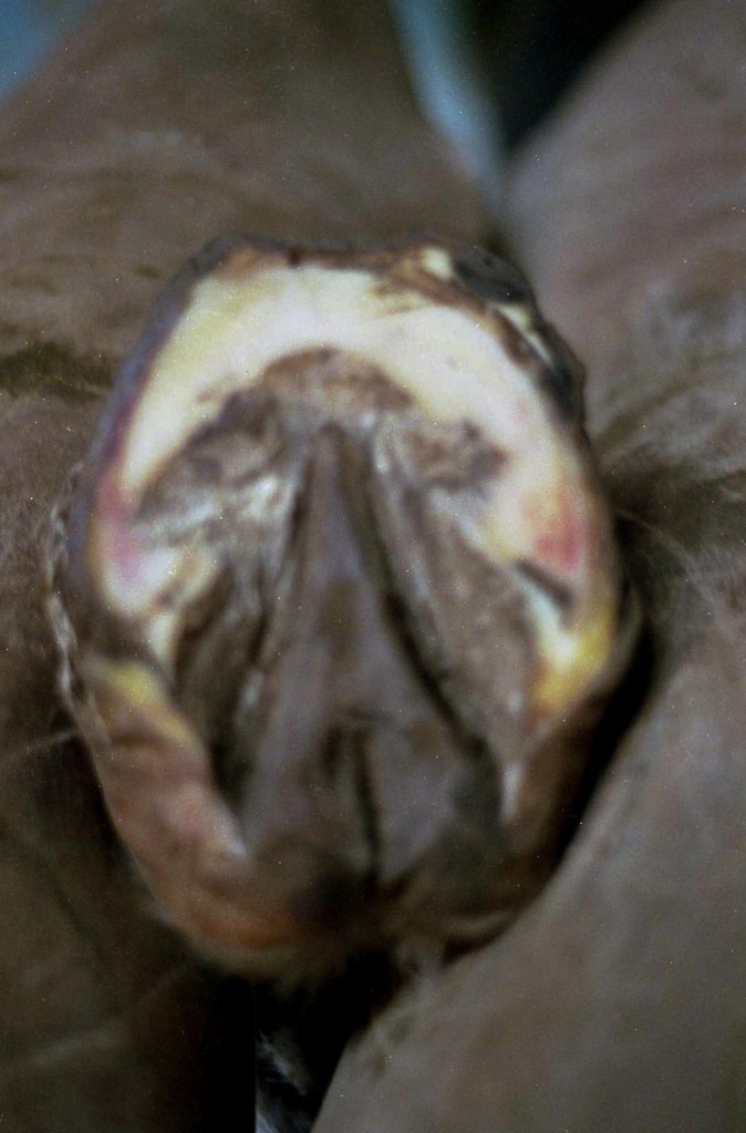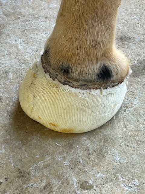 Lateral view: severe tearing of hoof wall and sensitive laminae with drainageBottom viewAluminum bar shoePacked with Biozide gel (an iodine based wound dressing), gauze lightly packed over to hold in medication and paddingFiberglass cast over the hoof– important that the cast does not affect or put pressure on the coronet band or the wound — this cast allows horse to be turned out while wound heals. This is an effective bandage for horses that need turnout or are fractious to work on.