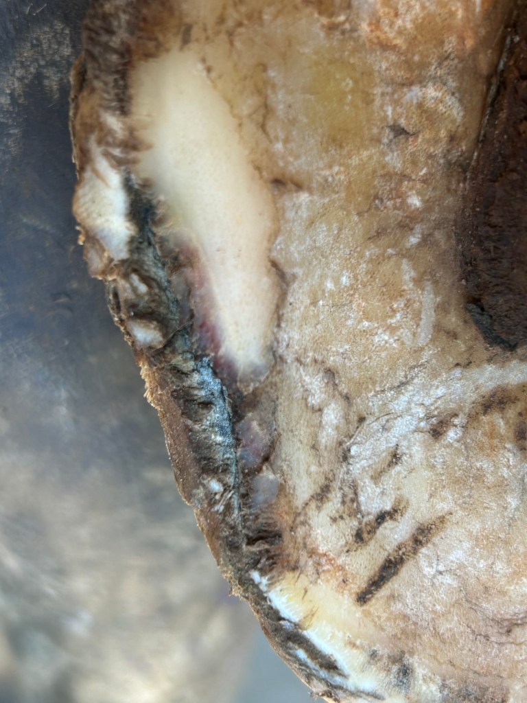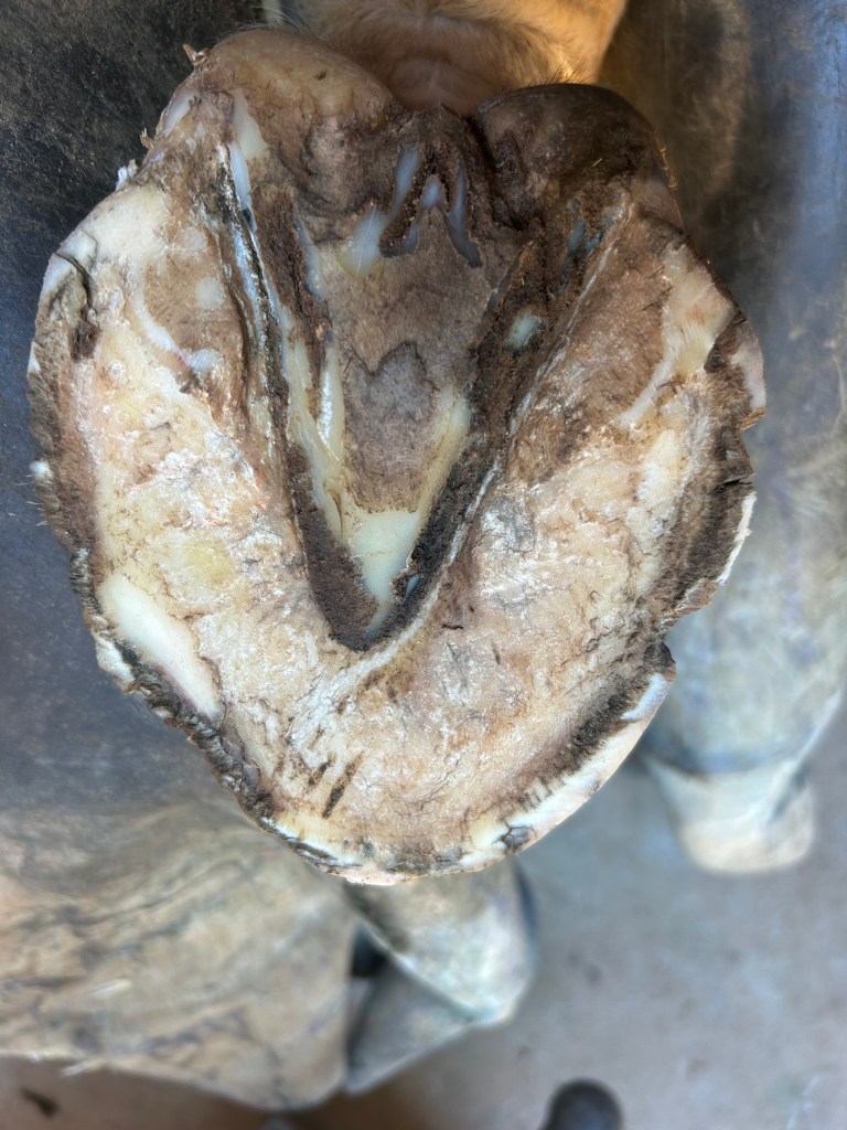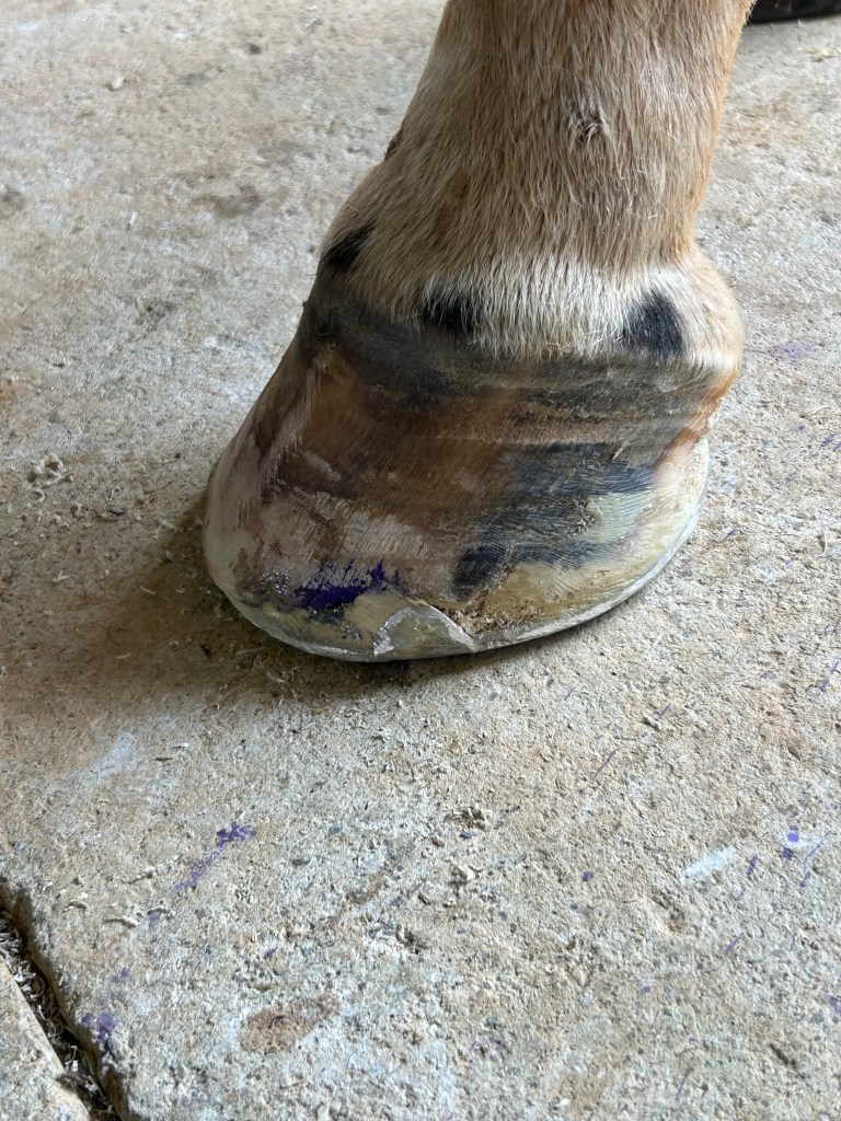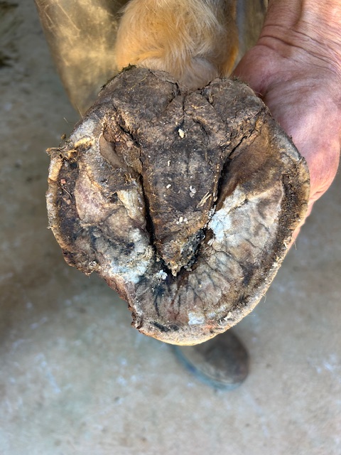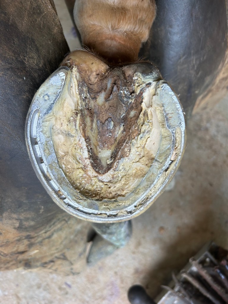 Lateral view: severe tearing of hoof wall and sensitive laminae with drainageBottom viewAluminum bar shoePacked with Biozide gel (an iodine based wound dressing), gauze lightly packed over to hold in medication and paddingFiberglass cast over the hoof– important that the cast does not affect or put pressure on the coronet band or the wound — this cast allows horse to be turned out while wound heals. This is an effective bandage for horses that need turnout or are fractious to work on.