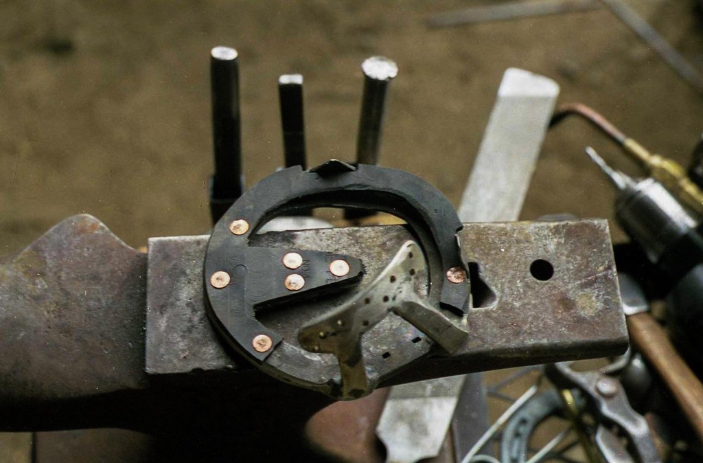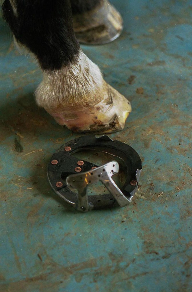 Horse was caught in a cattlegaurd, both front feetSevere bruising of the sole, multiple abscesses in the hoof wallGoose bar heart bar shoe w/ 3/4 rim padGoose bar was copied from a copper template as the hoof is an oblique cone shapeThank goodness enough hoof wall thickness for screws!Bottom view, only 3 medial nails. Screws on lateral quarter. After a reset and adequate hoof growth, horse returned to normal shoes and then to being barefoot.