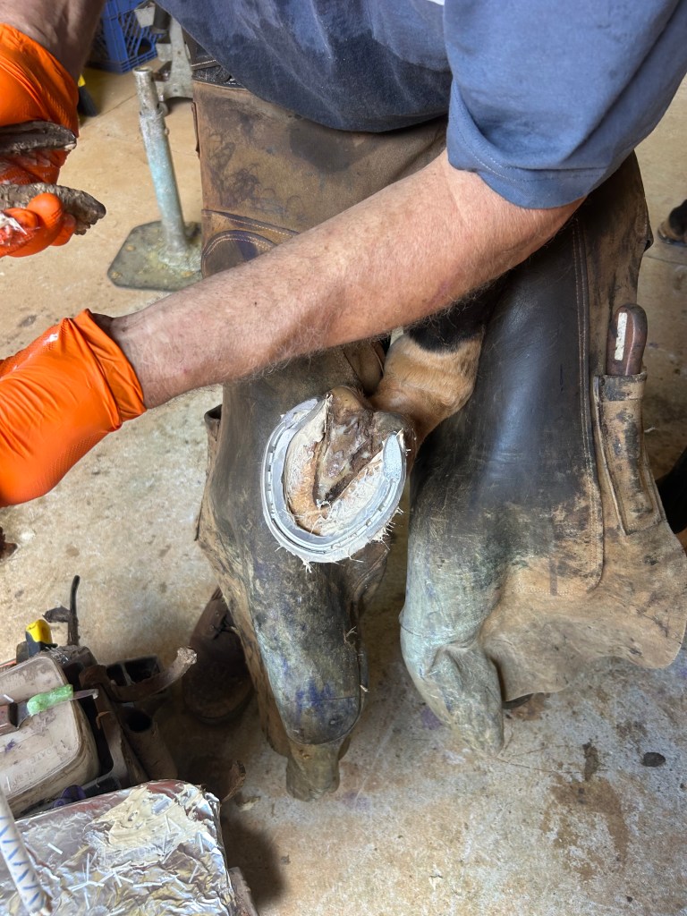 Bottom view of hoof capsule being prepped for a glue on shoeShowing the affected area which will be packed with medicated waxMedicated wax now addedGlueing the shoe onSide view, wax goes up the hoof wall prior to glueingBottom view, glue on shoe