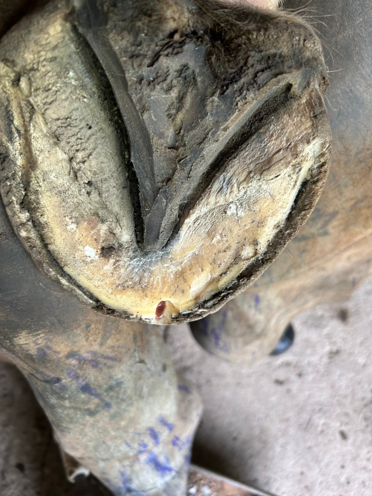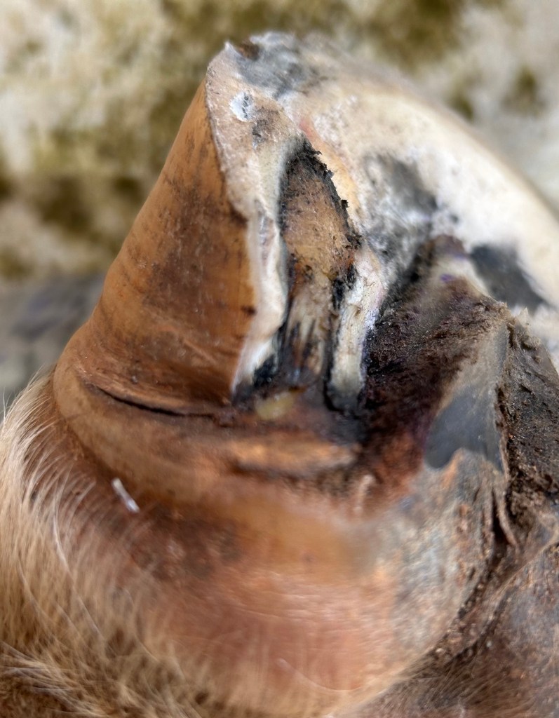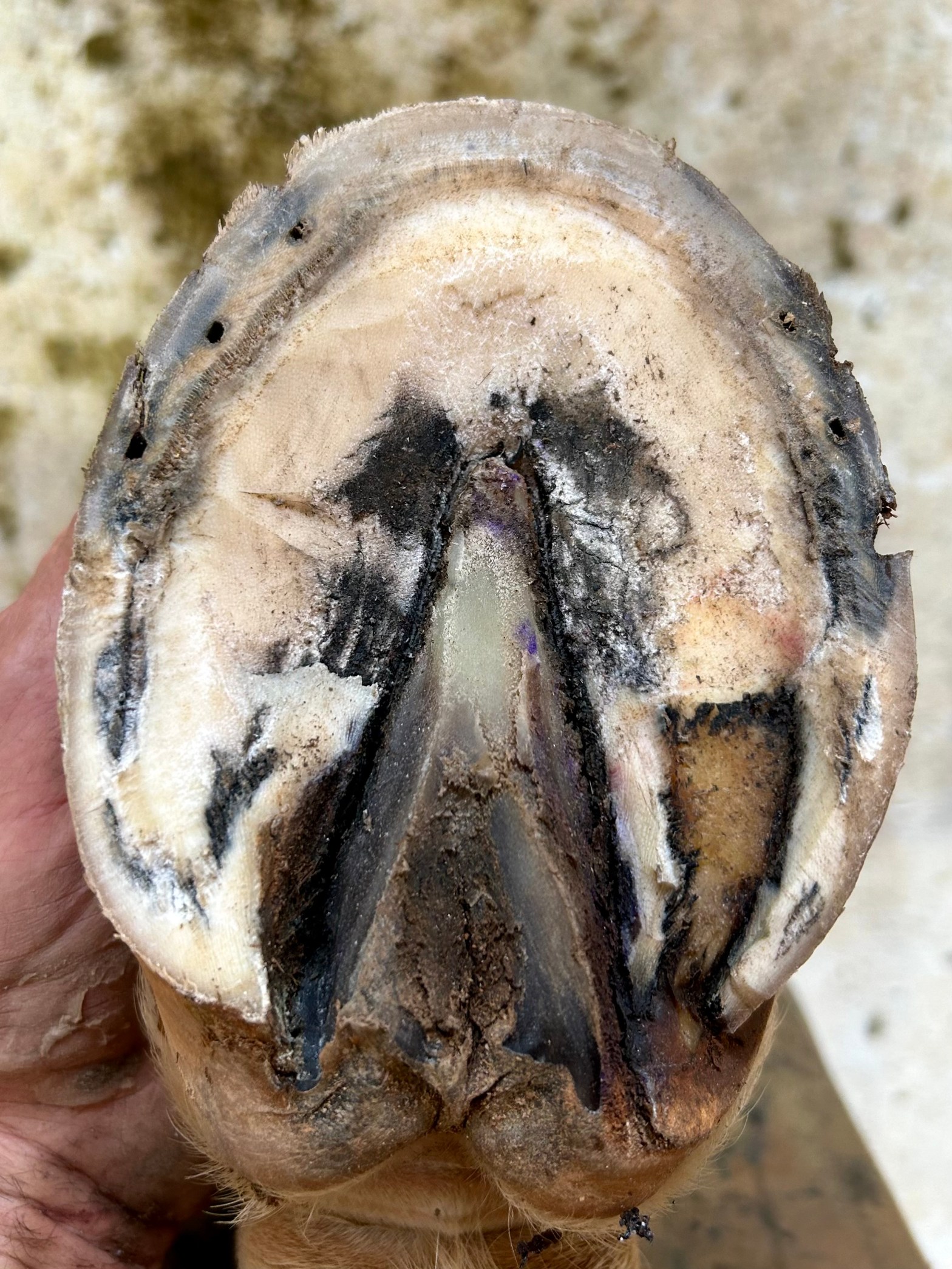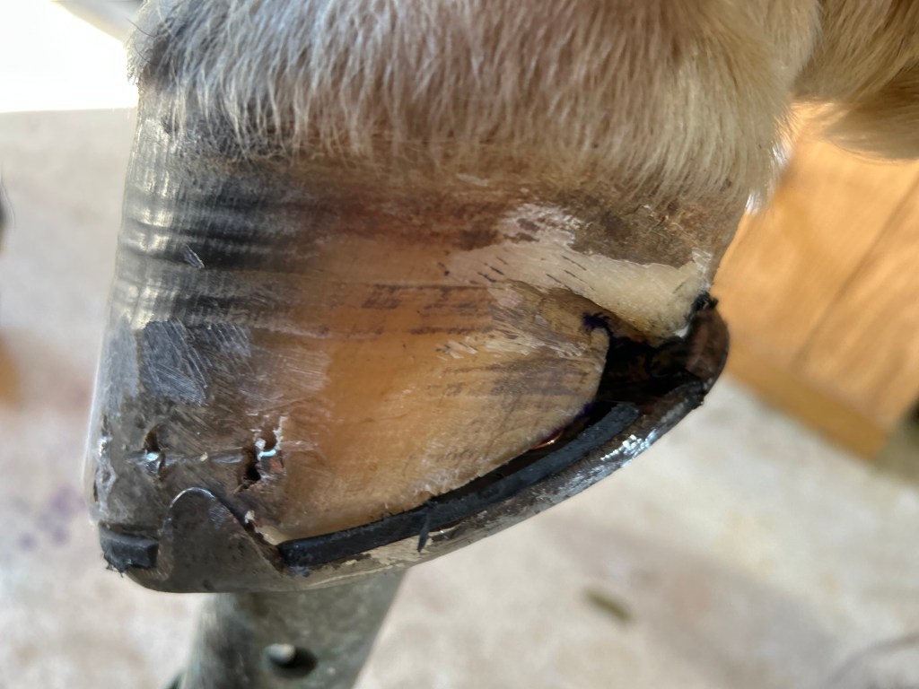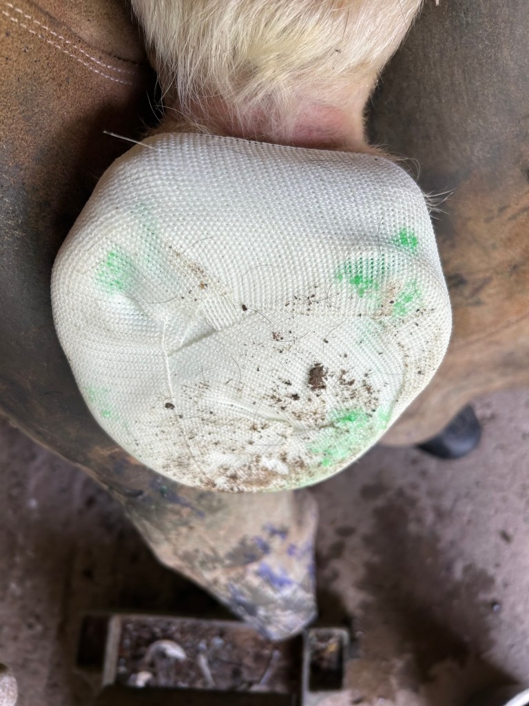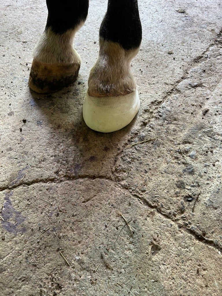 Barefoot horse with toe abscessBandaged for continued turnout with epsom salt poultice, cotton, fiberglass cast. This works well with belligerent horses that can’t be soaked or horses without access to stalls. The hoof can still be soaked though the cast with additional poultice.Care must be made when putting on cast to keep it off of coronet band as this is blood supply for the hoof. Additionally, cotton is added with the poultice material as padding. The cast must be set prior to putting the horse’s foot down as to not push into the sole.