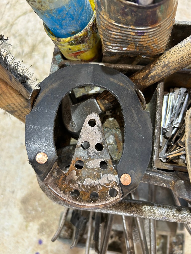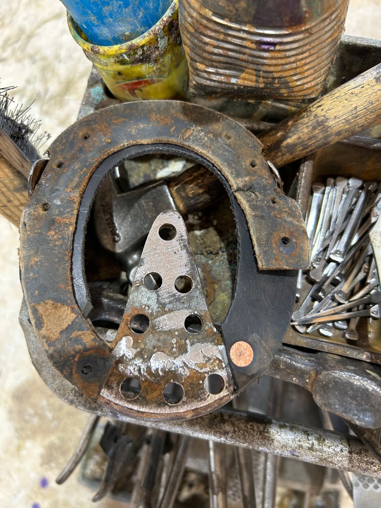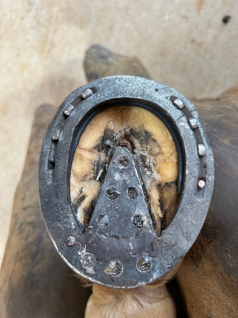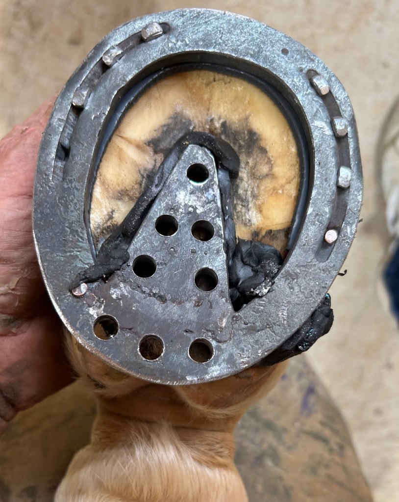 ZSP is put in heel to keep out debrisEquithane applied under the heart bar to enhance frog support.Heel abscess is growing out. Top of the hoof wall is removed above the abscess as it grows horizontal because it is not attached to the wall below it. The rim pad for the new shoe is extended as hoof growth proceeds down.Follow up shoeingThe size of the abscess pocket is diminishing.Heel abscess is growing out. Top of the hoof wall is removed above the abscess as it grows horizontal because it is not attached to the wall below it. New rim pad is applied.