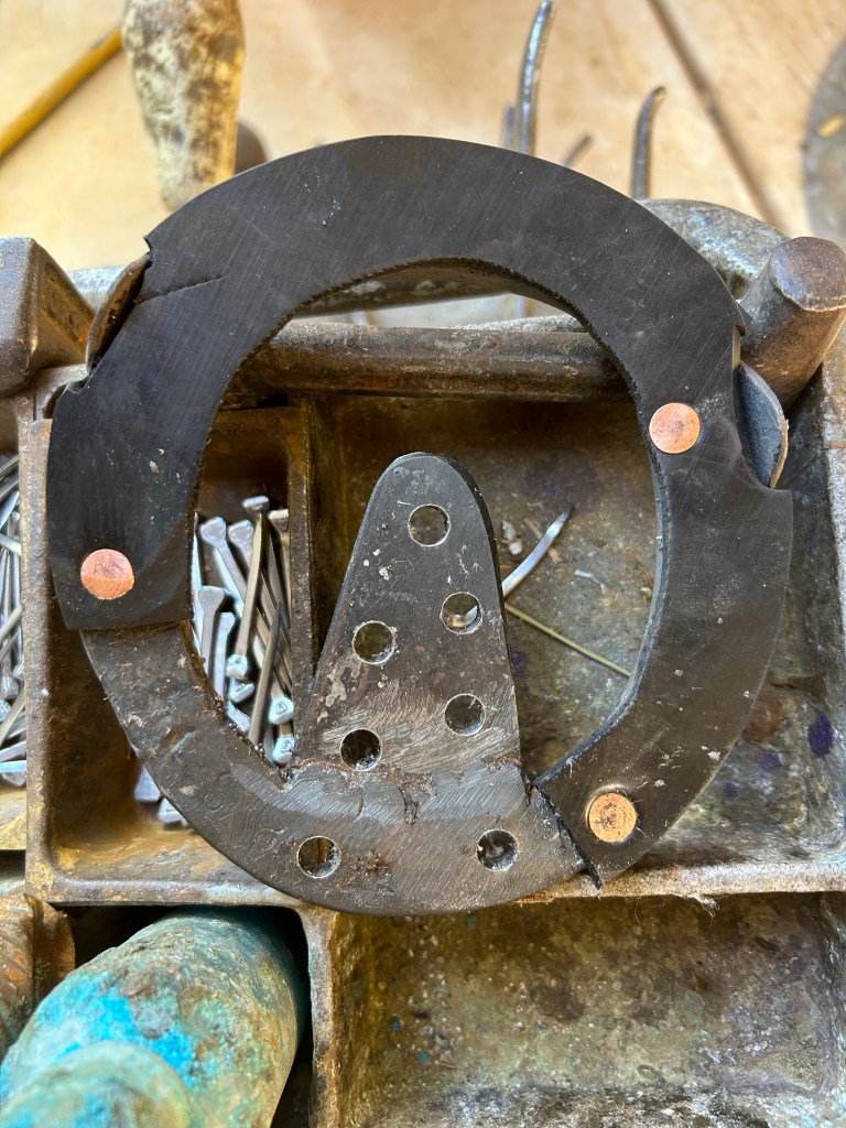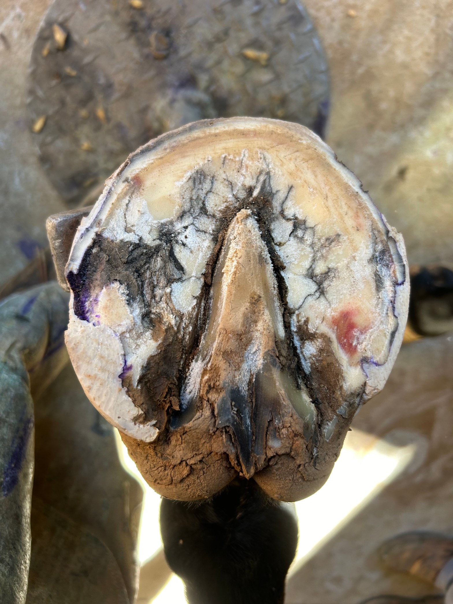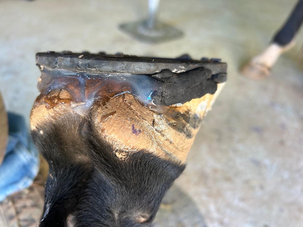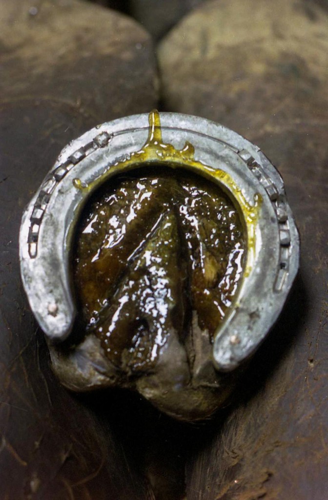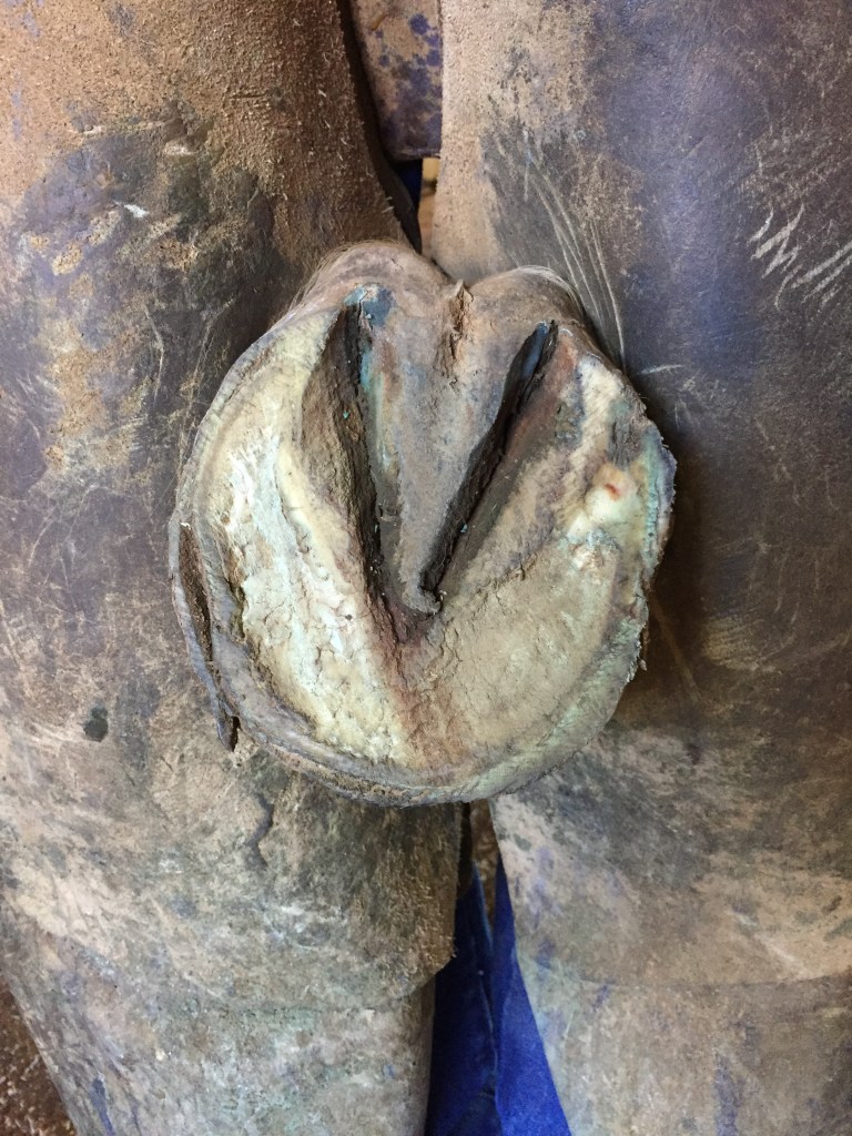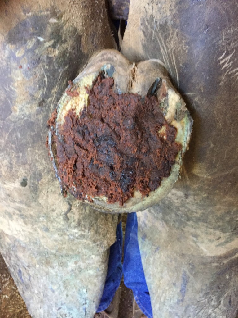 Chronic heel bruising with thin walls and soles.Heart bar, floating the medial heel using rim pad.Heart bar, installed with Equithane under the heart to transfer weight and relieve pressure on the heels. Proximal view showing the floated medial heel with ZSP, a putty like material that is flexible and soft, to take up the space and keep debris out.