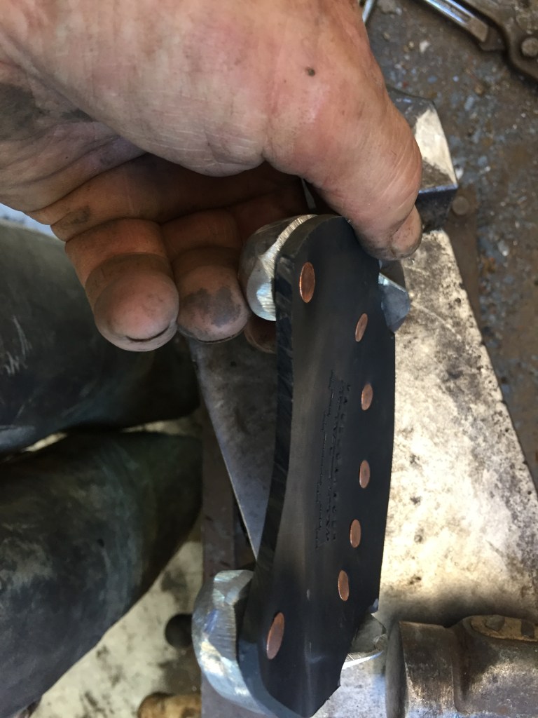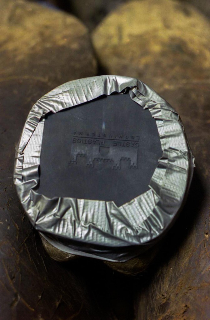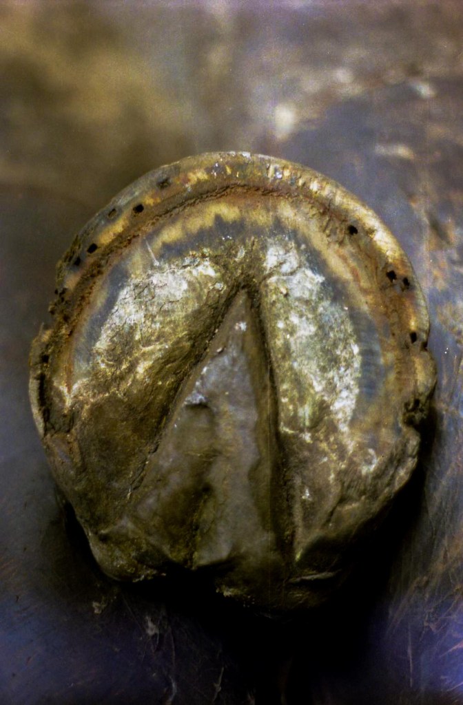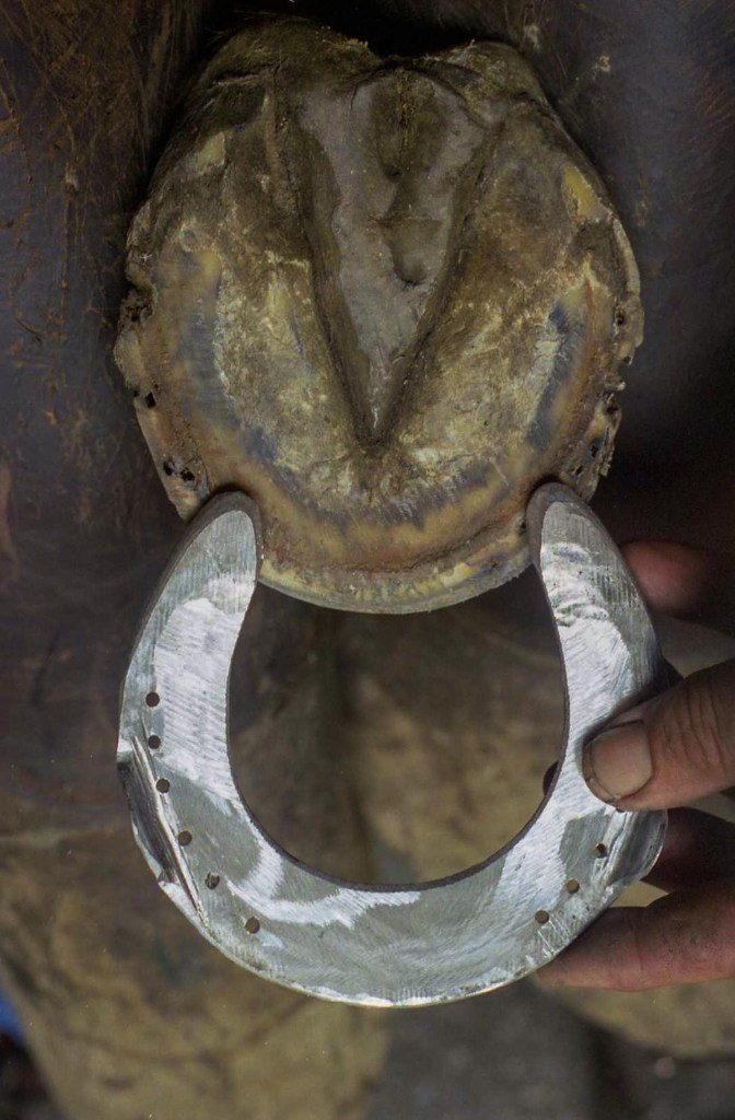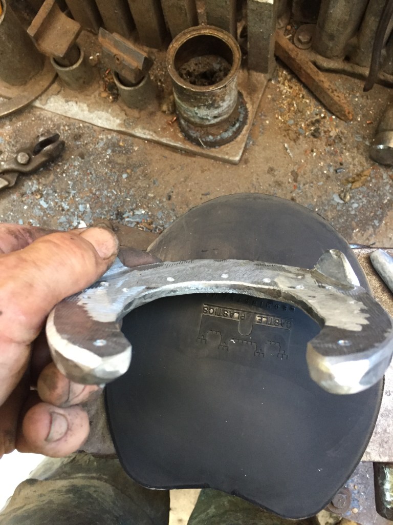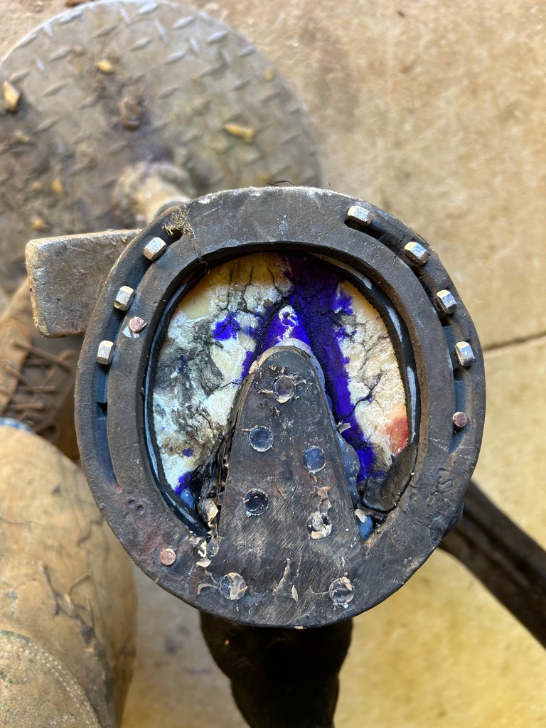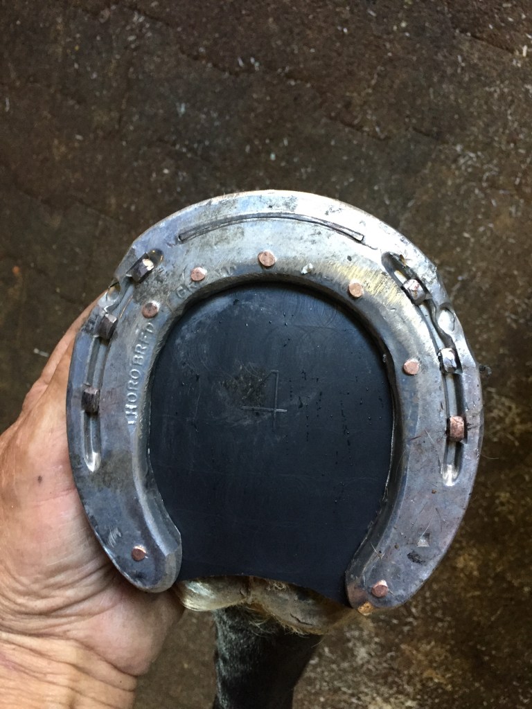 Horse presented with tenderness in the toe area to the touchThe previous shoe lacks sufficient coverage and protectionThe sole needs to be protected from ground pressure and all obstruction, and just as important, from SHOE PRESSURE in the compression portion of the horse’s stride. An extra wide web shoe that is radically concaved out is the best choice. A rim pad properly cut out gives extra height for sole protectionThe shoe is now protecting sensitive areas without touching them. Venice turpentine was used at the time, Magic Cushion would work even better to ease solar pain & toughen it up.Pad was taped to the bottom to keep debris out until sole toughens up