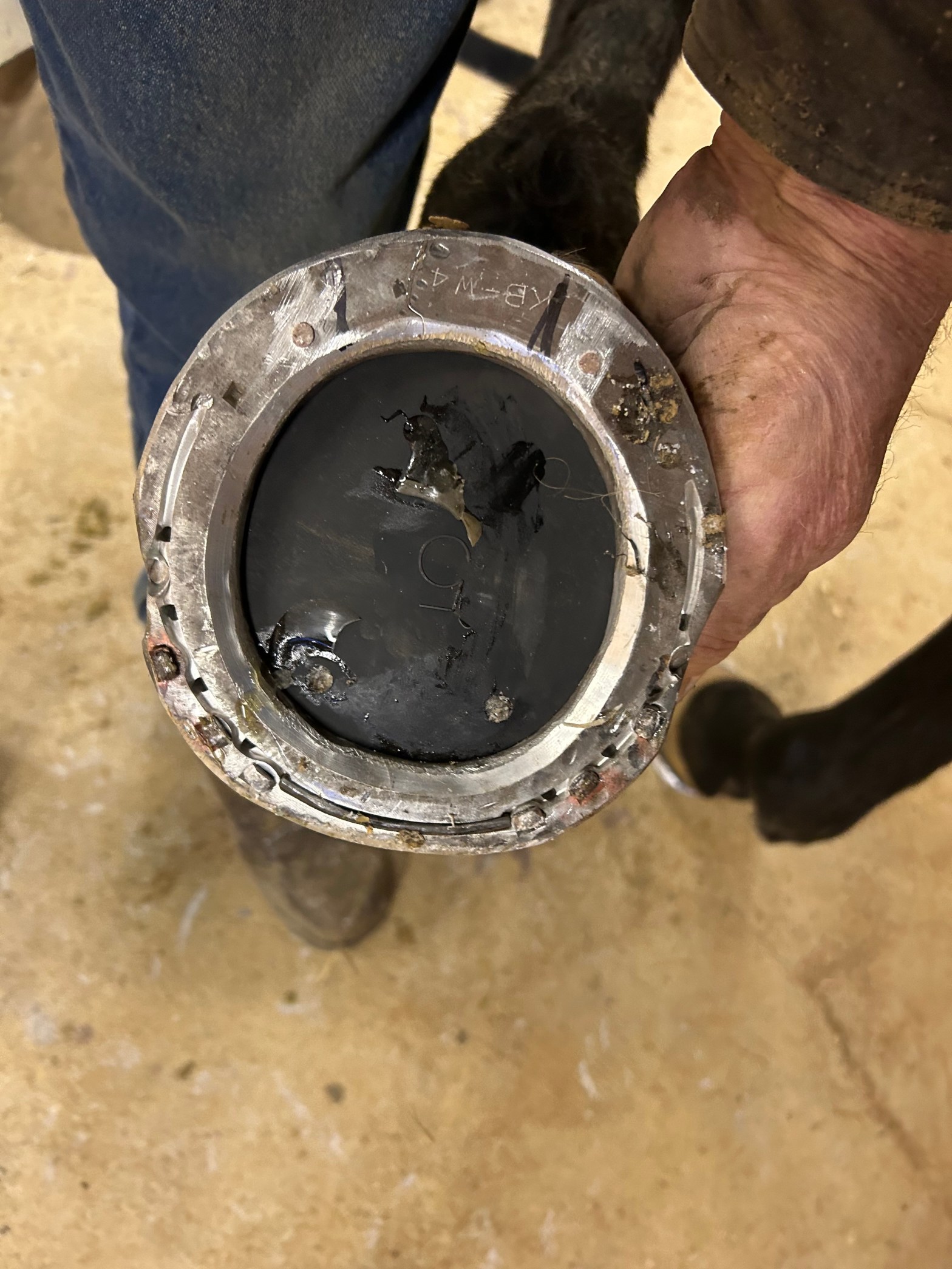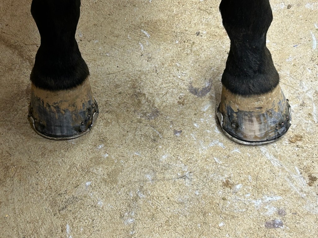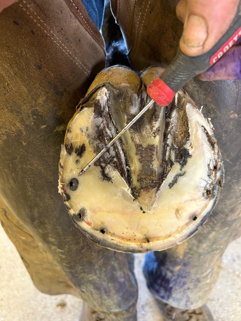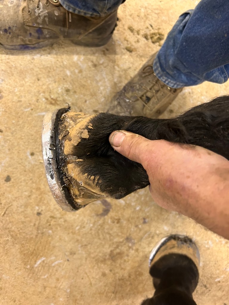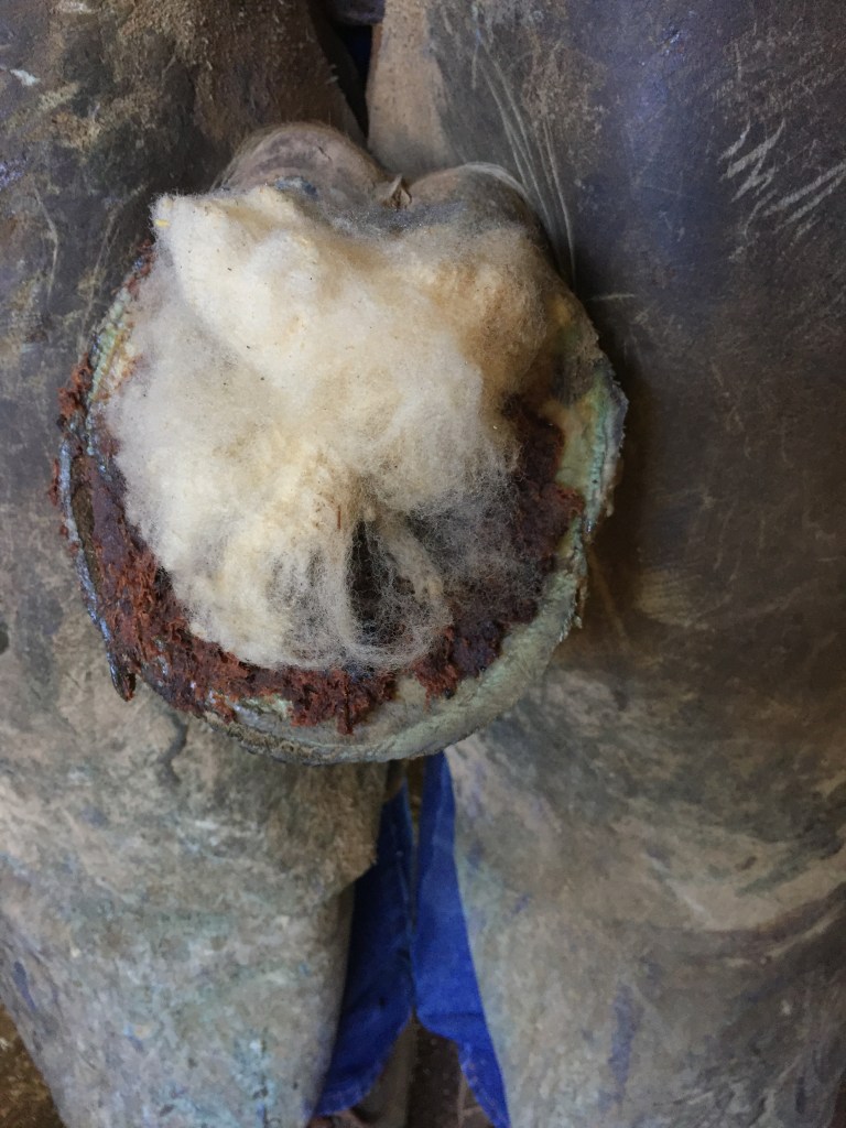 Large Warmblood horse presented with intermittent lameness, thin walls, thin soles. One nail hole has penetrated the sensitive areaPacking with Magic Cushion to harden sole and ease solar painLambs’ wool for cushioning on the solar surface and to help hold the Magic Cushion in place.Shod with eggbar, equithane injected for a little more solar supportFit full for support behind the foot (bell boots will be helpful)frontal view, shod