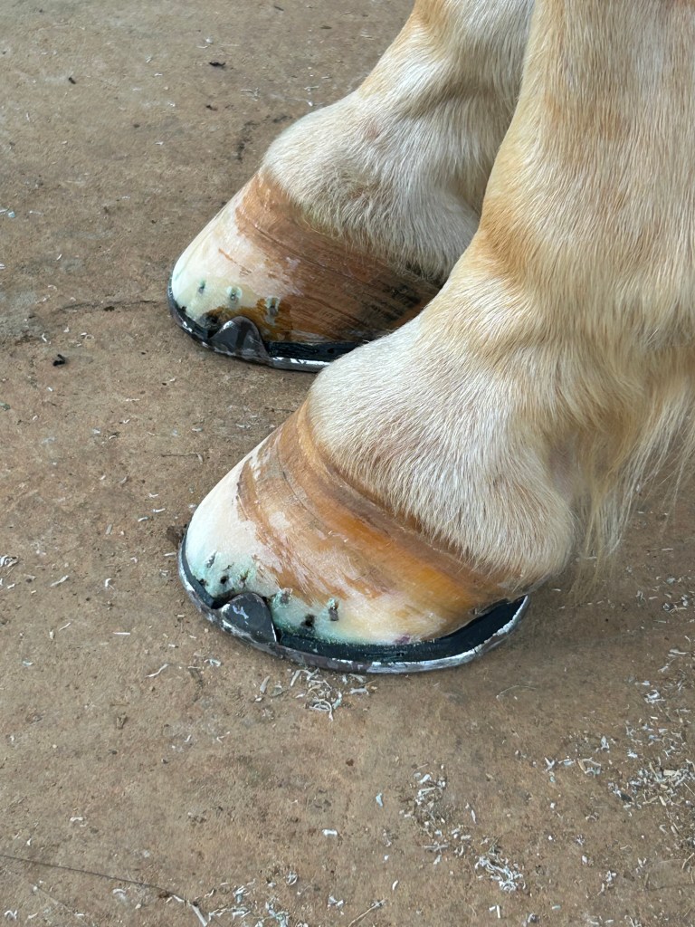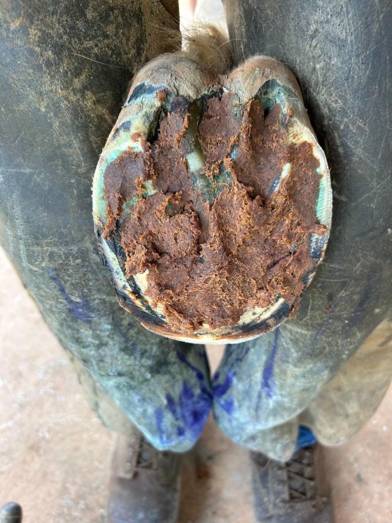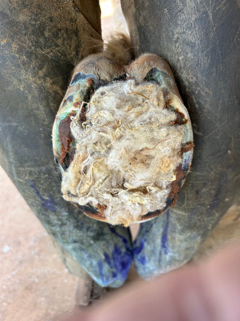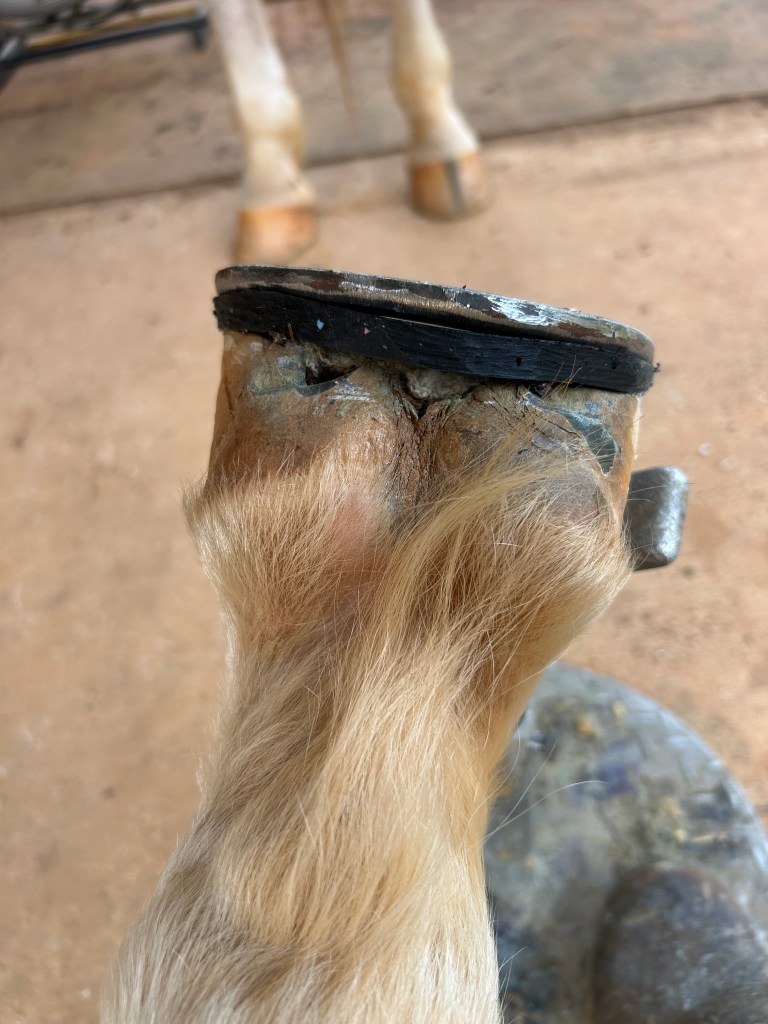 After trimming, Magic Cushion is applied to help with solar pain. Lambs’ wool for cushioning on the solar surface and to help hold the Magic Cushion in place.Rolled rocker toe to increase breakover.Fit full to the posterior portion of the foot with 3 degree wedge pad.End result. This is a classic successful shoeing recommendation for this condition throughout the years.