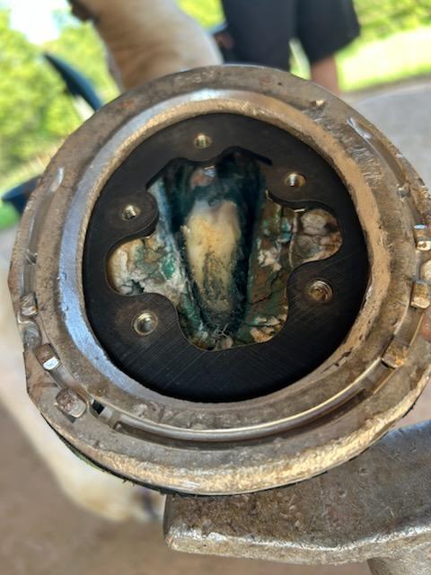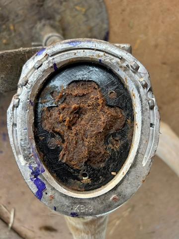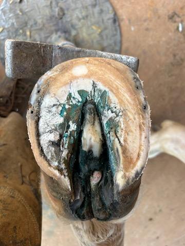 Contracted heels are more prone to thrush.The thrush has reached deep into sensitive tissues and needs caudal (heel) support and regular treatment. Shod with aluminum bar shoe and hospital pad.After cleaning the frog and medicating, it is packed with magic cushion.Hospital plate applied to allow regular treatment.Rear of the frog can still be treated with thrush medication.