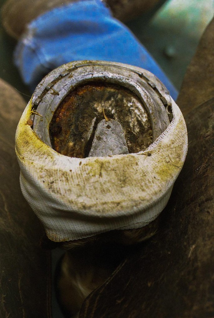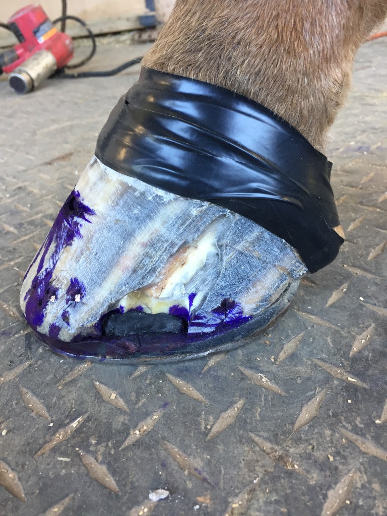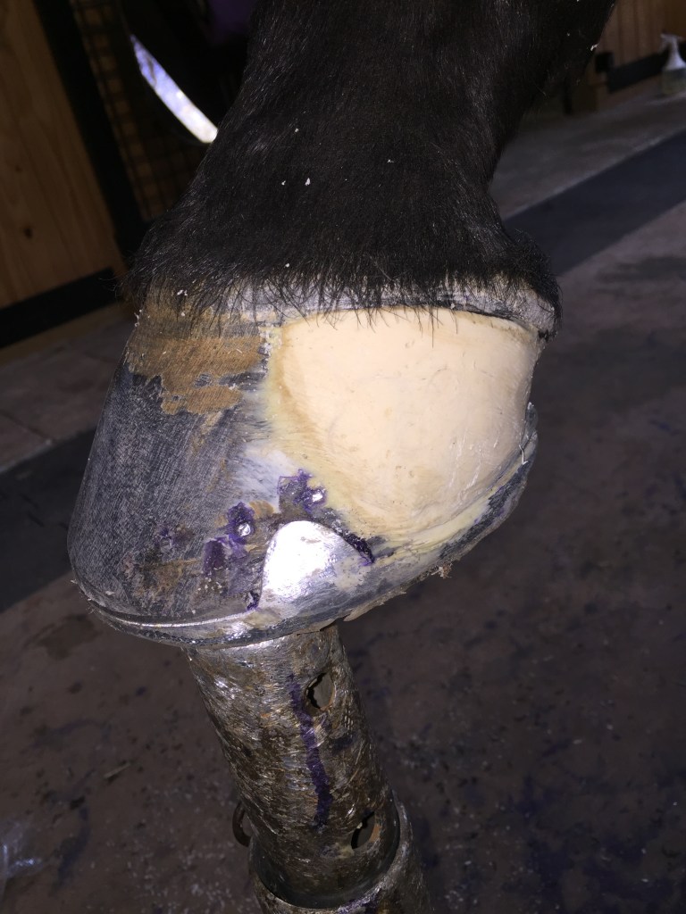 Resected. Note the ledge of the pad. The ledge will be platform for the glue & fiberglass, allowing to create more medial supportQuarter crack cleaned with acetone, then disinfected tape is protecting the coronet bandFilled and with more medial support. Pad is filled with Magic Cushion, lambswool, and Equithane to equalize weight bearing