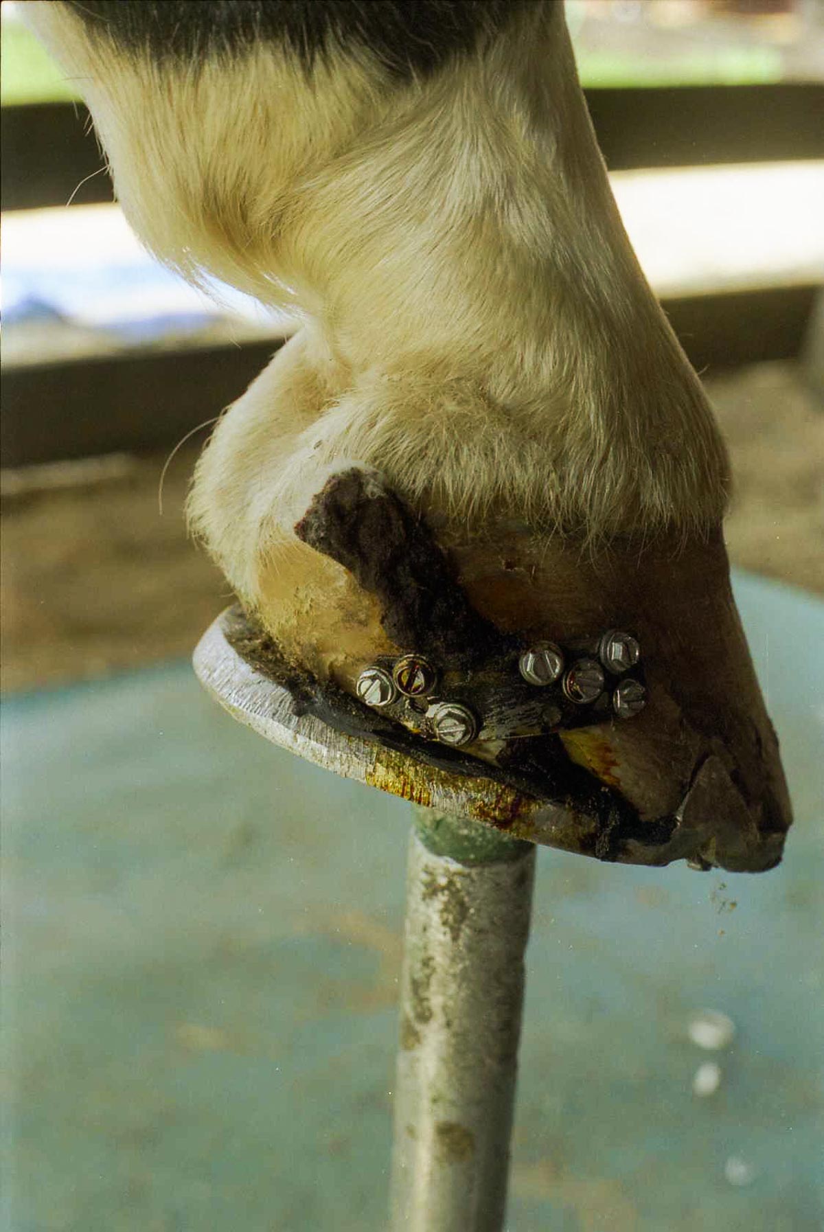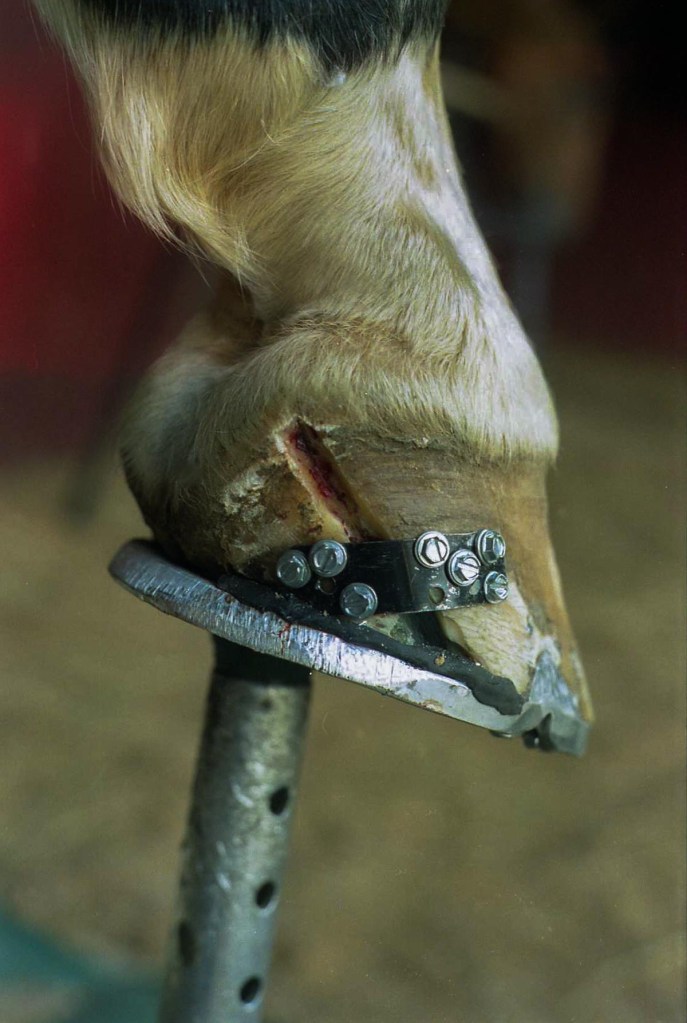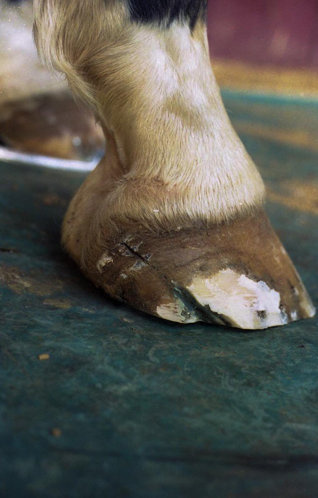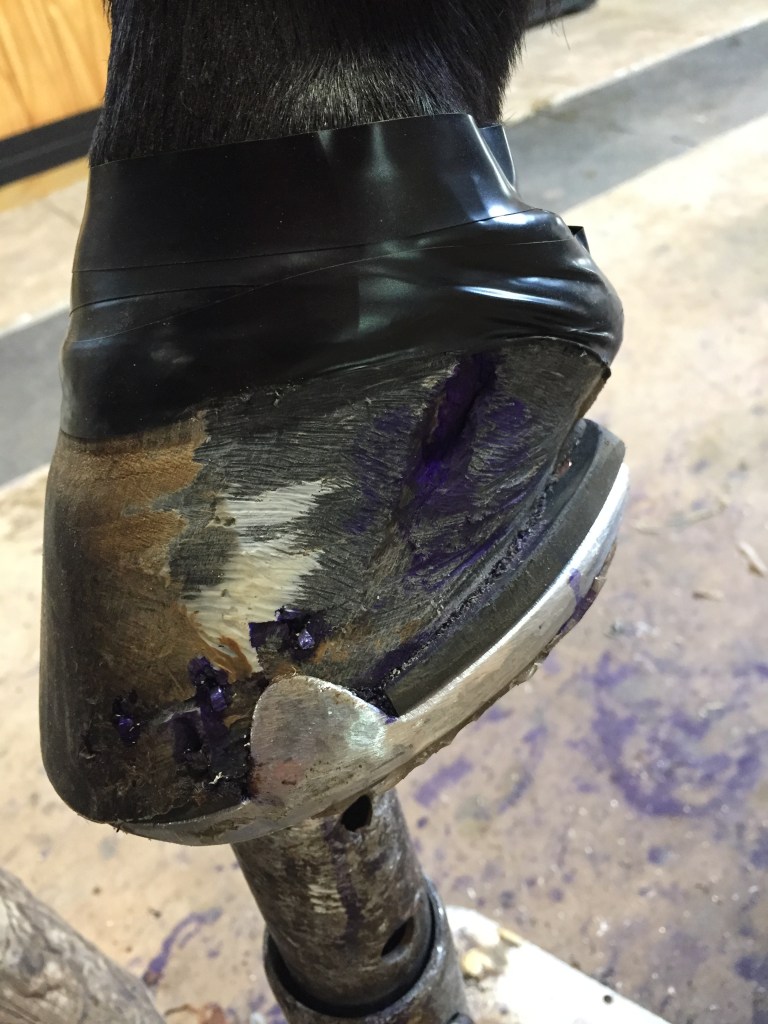 Horse presented with active and painful quarter crackCrack resected, exposing sensitive laminaeHeart Bar with ZSP (a soft putty to fill voids) as the lateral quarter will be floatedMetal strap installed to stabilize the hoof while the sensitive laminae heals, as drainage is completeHoof crack is packed w/ cottonCotton is soaked in iodineFoot wrapped in fiberglass cast which will keep out debris and hold in bandage for several daysBottom view of heart bar and casting materialAfter drainage has stopped and sensitive laminae is hardened, a patch of glue and fiberglass; Keratex wax was applied in the recess of the crack prior to glue.