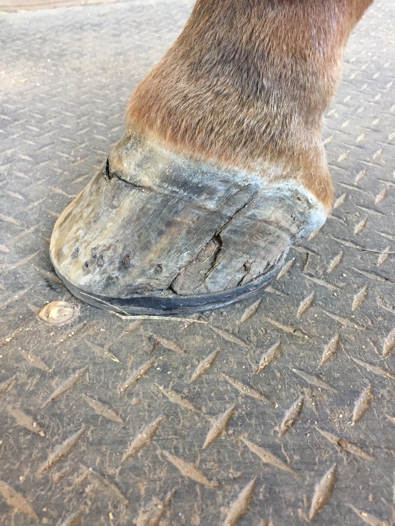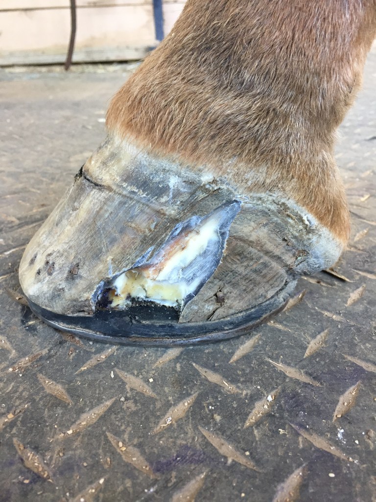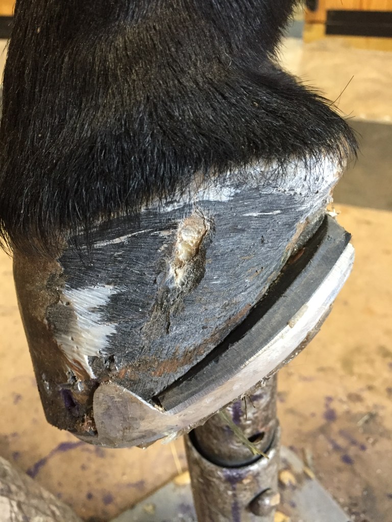 Horse presented with previous abscess and quarter crack with white lie disease, which was likely from the crack not being addressedQuarter resected, removing all infected laminae, shod with shoe and pad, with Equithane filled to rim at shoe to help distribute weight bearing and ease pressure on hoof wallFoot prepped and ready for glue and fiberglass, ZSP putty on base to prevent seepage of glueFoot filled. No sensitive tissue exposed so horse can get back to regular routine. The shoe is fit with an Equithane pour-in pad to equalize static and active hoof capsule pressure.