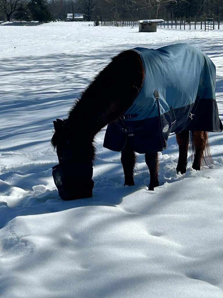 In the wintertime, on those cold, windy days/nights, we blanket the horses according to their needs and the thickness of their coats. All horses have access to heated water tubs to ensure that they stay hydrated, as horses are more prone to colic in dry, cold conditions.